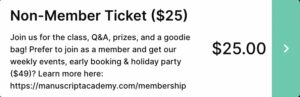Non-members: Head to the event page. That’s usually https://manuscriptacademy.com/[faculty first name]-panel or https://manuscriptacademy.com/[faculty first name]-class. For example, the panel with Léonicka Valcius is at https://manuscriptacademy.com/leonicka-panel.