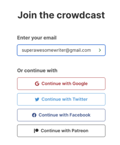 Enter your email. If you have an existing account Crowdcast account, you’ll be prompted to sign in. If you don’t, you’ll be walked through creating a new one.