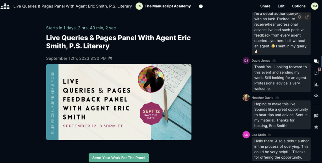 You’ll be redirected to the event. That looks like this (though, of course, you’ll see your event’s title, header graphic, and live chat):