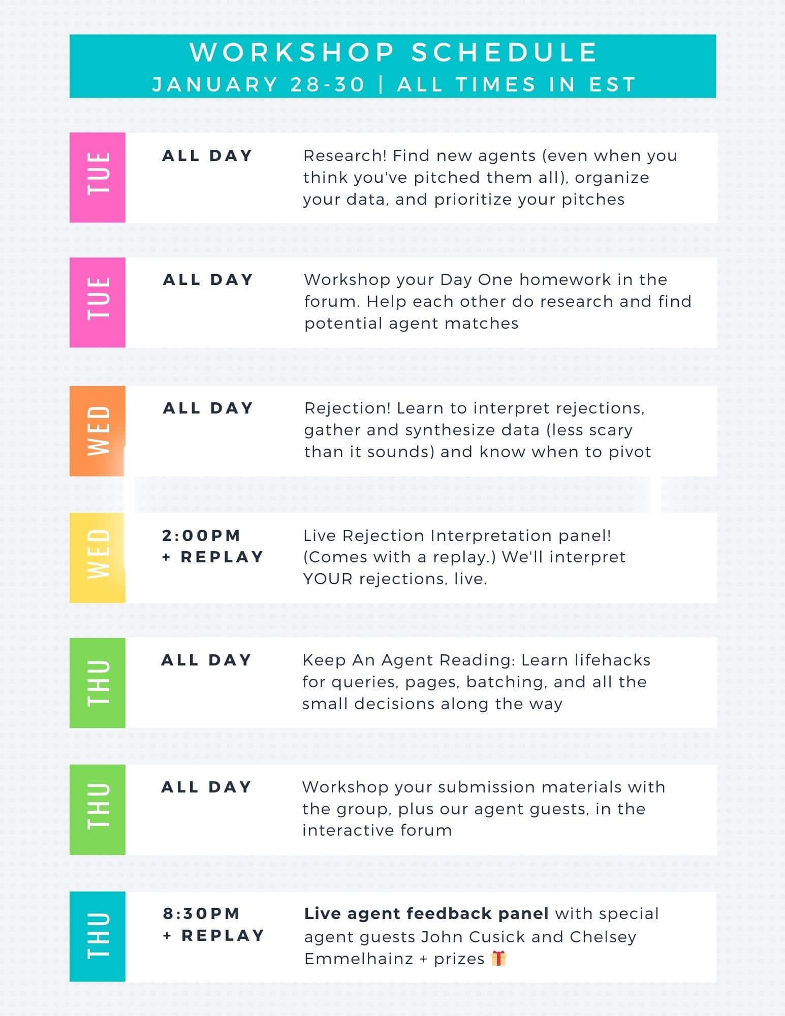 - We will be sending out the daily (recorded, edited) classes at 9:00 am every day (New York time/ET). This will give you a full 24 hours to watch the short videos, do the writing activities, and join the critique fun in the forum, before we move on to the next activity.
