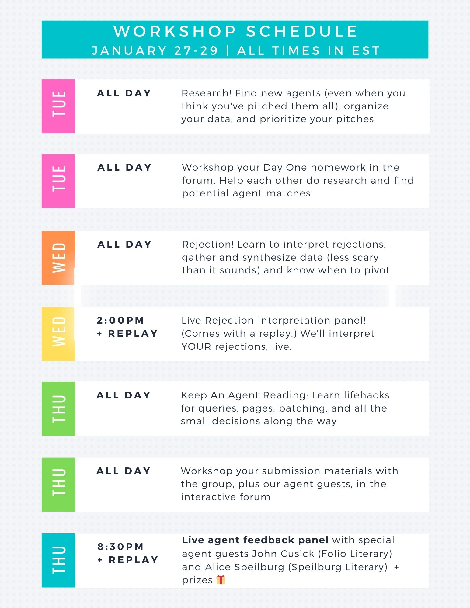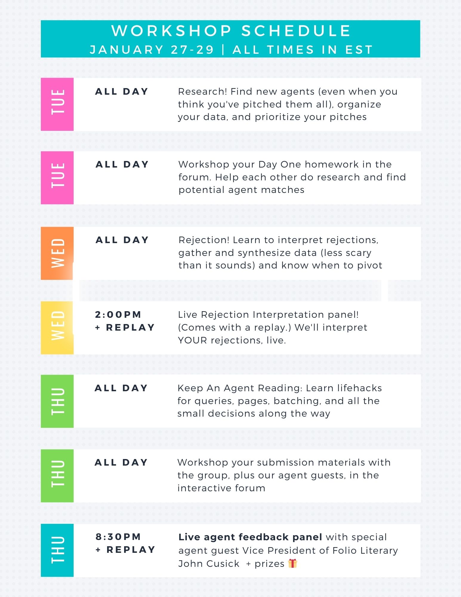 Lastly, this is a low-pressure event. Everything comes with a replay. It’s meant to be both informal and fun, all while helping the bottom line of your writing.